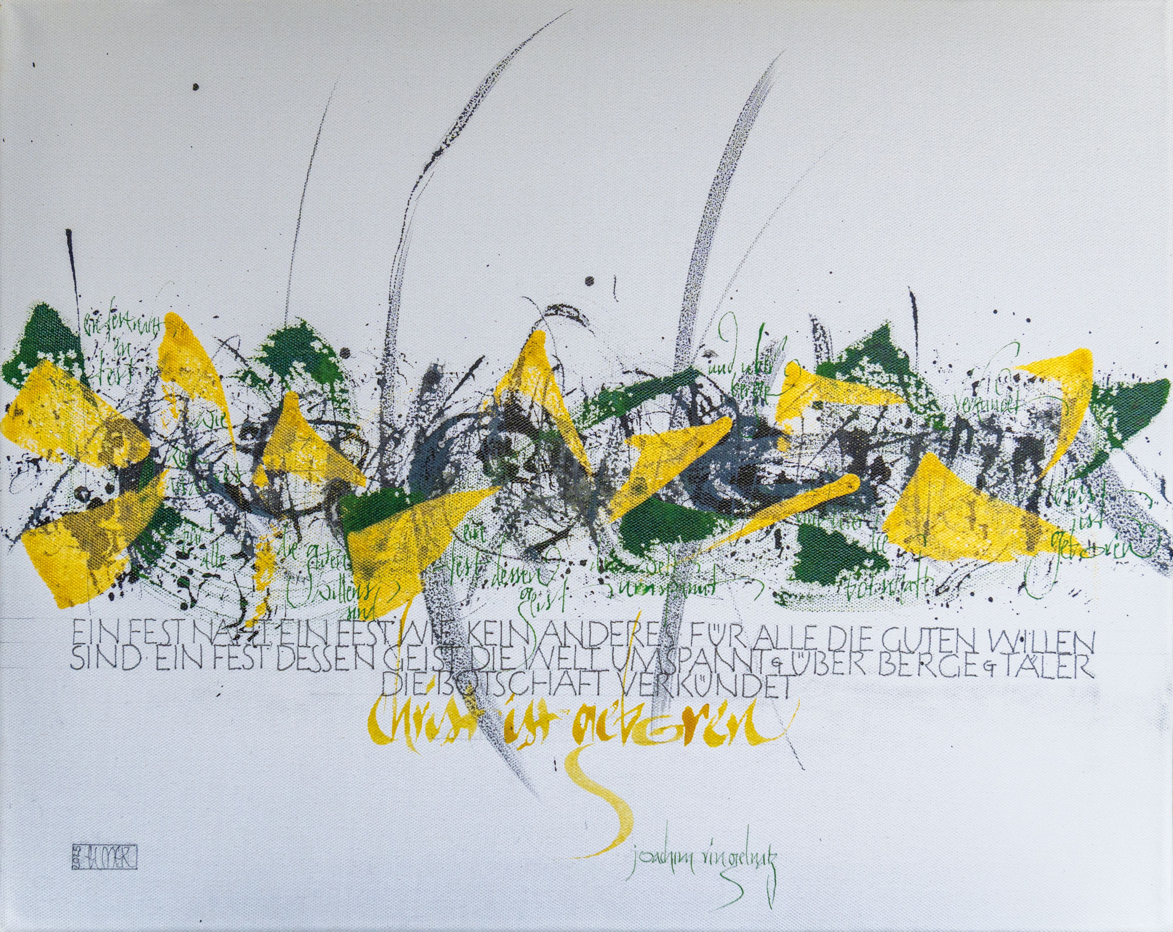 „Christ ist geboren“ heißt das diesjährige Weihnachtskartenmotiv, das verdeutlicht, wie die Kalligrafie es vermag, Texten und Gedanken eine bildliche Form zu geben und Stimmungen und Gefühle einzufangen. Mit Ihrem Motiv lässt Elke Lemmer die Betrachtenden in eine christliche Festtagsstimmung eintauchen. Der Text auf der Karte stammt von dem deutschen Schriftsteller Joachim Ringelnatz (1883-1934) und lautet: „Ein Fest naht, ein Fest wie kein anderes, für alle, die guten Willens sind. Ein Fest, dessen Geist die Welt umspannt, über Berge und Täler die Botschaft verkündet: Christ ist geboren“.